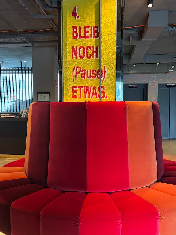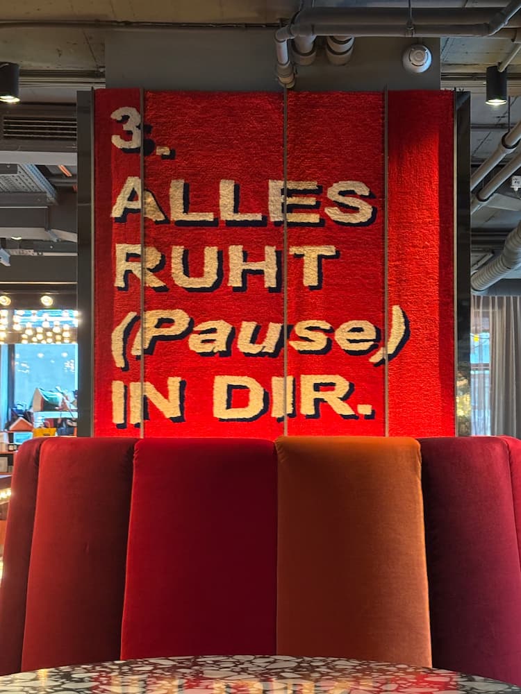 Mitten in der Lobby des 25hours Hotel Wien entsteht ein Moment des Innehaltens. Eine textile Intervention, die sich zwischen Kunst, Architektur und Sprache entfaltet. Die Arbeit reagiert auf die Wege und Blickachsen des Raumes. Je nach Standpunkt treten andere Textfragmente in Erscheinung. Die Worte stehen sich gegenüber, antworten einander und formen eine Abfolge von vier Akten – eine orchestrierte Struktur zwischen Bewegung und Stillstand.